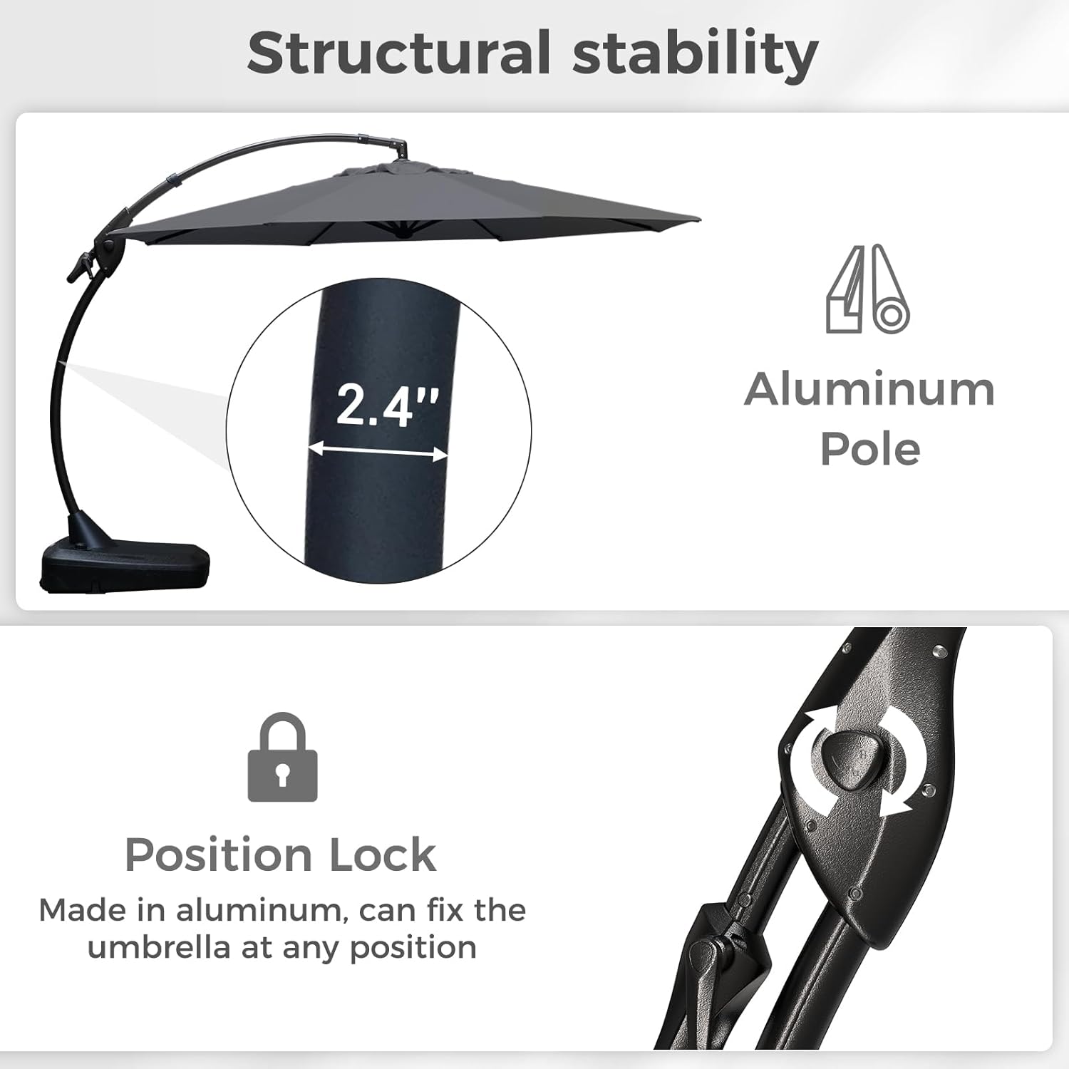 - STURDY AND STABLE: The 12FT patio offset umbrella features a 2.4" diameter aluminum pole and 8 reinforced steel ribs for superior strength and support. All frames are treated with industry-leading anti-corrosion for maximum rust protection