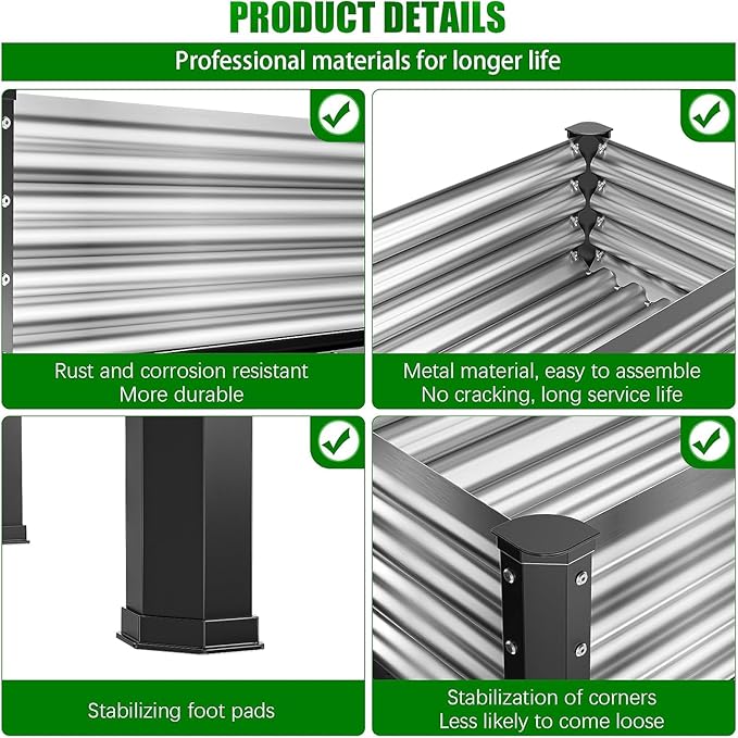 - 【High Quality Raised Garden Bed】-Raised garden bed is made of stable thickened galvanized metal steel ,it is durable, reusableenvironmental friendly and easy to clean,withstand harsh weather conditions ,which makes this product more stable and solid than wood or plastic beds and won't crack in cold temperatures. can be expose to sun, rain, snow for a long time.