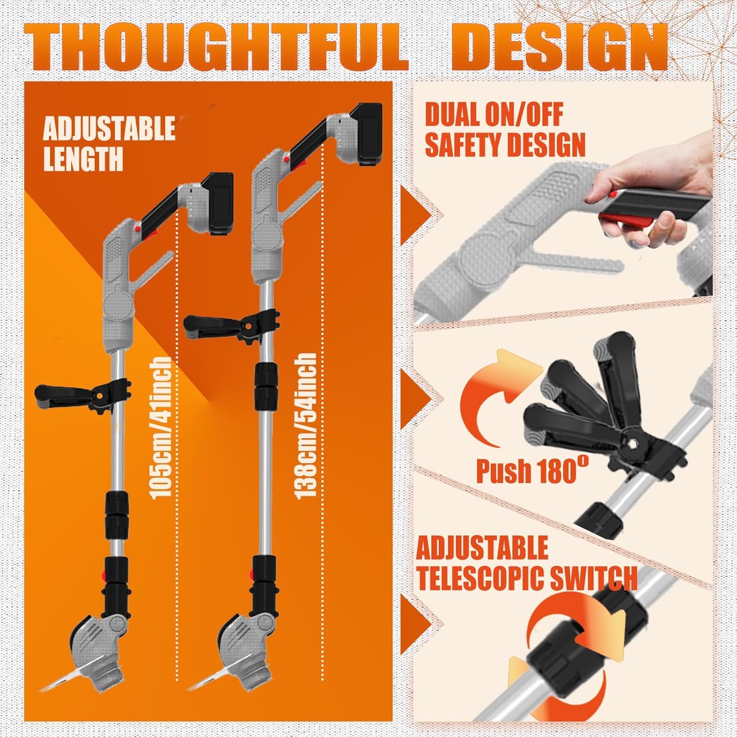 - ใErgonomic String Trimmers Grip & Adjustable Height & Rotating HeadใThe battery operated weed wacker with extra labor-saving handle, you don't need to bend down. Work in the most comfortable position and greatly reduce stress on your back and waist. The adjustable telescoping pole adjusts in length from 35-55 inches to provide the length everyone needs. The no string weed wacker head angle is adjustable from 0-90ยฐ, allowing you to easily care for any hard-to-reach nooks and crannies
