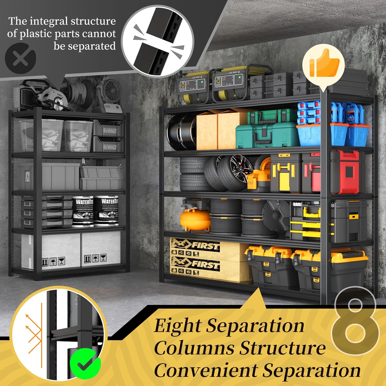 - Sturdy and Durable Construction: Built with high-quality metal and reinforced with double-thickened legs and an anti-rust coating, this shelving unit offers exceptional strength. Each shelf can hold up to 600 lbs, with a total weight capacity of 3000 lbs, making it ideal for heavy-duty storage needs.